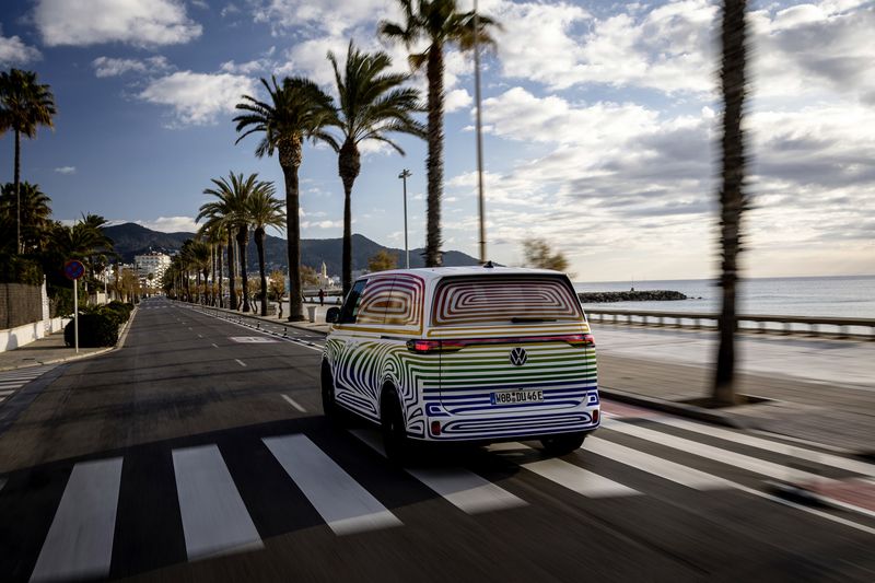 新车侧面造型较为方正,能够保证车辆充裕的内部空间并提供更加舒适的乘坐体验。此外,该车还配备了大尺寸熏黑轮圈,运动感十足。车尾部分,造型修长的贯穿式LED尾灯组极具辨识度,车顶扰流板及鲨鱼鳍天线则进一步提升了车辆时尚感。车身尺寸方面,大众ID. BUZZ长宽高分别为4,712/1,985/1,937mm,轴距为2,988mm。