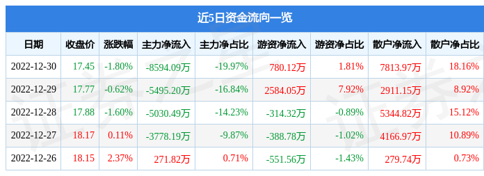 12月30日的资金流向数据方面,主力资金净流出8594.09万元,占总成交额19.97%,游资资金净流入780.12万元,占总成交额1.81%,散户资金净流入7813.97万元,占总成交额18.16%。