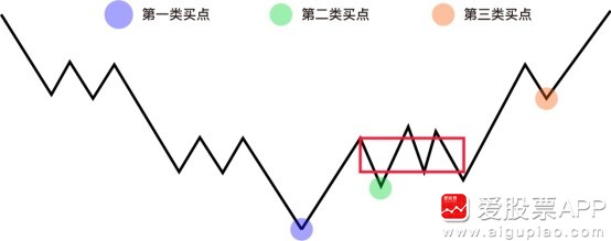 第二类买点定义:在第一类买点之后第一次回调不创新低的点,从空间角度考虑,是仅次于第一类买点的位置,具备一定的成本优势,图中绿色标注点为第二类买点,在一买的基础上,具备结构的稳定性。
